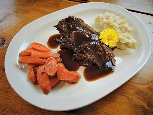 The gastronomic guru also recommends trussing (tying) the roast before you begin cooking, as it better holds it shape, and reminds us not to skip the searing step before the meat goes into the oven—it seals in moisture and gives the chuck a rich mahogany hue. Cooks should pair the roast with classic sides like buttery mashed potatoes or maple-glazed carrots and, as far as libations go, Chef Coffey suggests a cabernet sauvignon, Moat Mountain Brewing’s Czech Pilsner, or a glass of ice-cold milk (his children’s favorite).