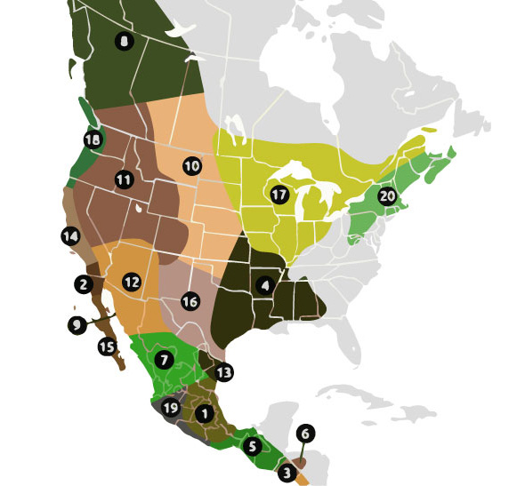 A map of the distribution of the 19 known subspecies of Canis latrans plus Canis latrans “var,” the eastern coyote, a hybrid between the coyote and wolf.